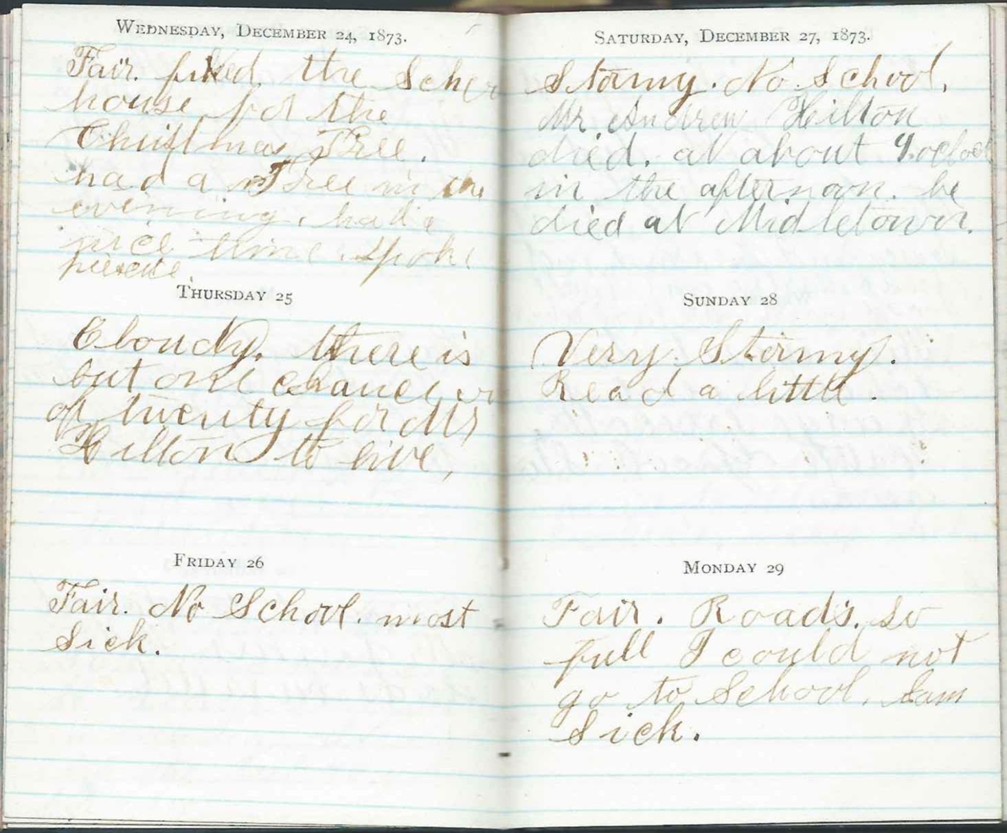 Monday, December 22, 1873: Fair. Went to School. Mr. Andrew Hilton taken sick over to Middleton [New Hampshire]. [Andrew, who would die on December 27, 1873, was a brother to James Hilton, who died on the 21st.]